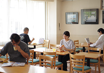 ご宿泊のお客様に朝7:00よりご朝食をサービス。クロワッサンを始め、数種類のパンと、ブレンドコーヒー、オレンジジュースなどをロビーにてご用意しております。